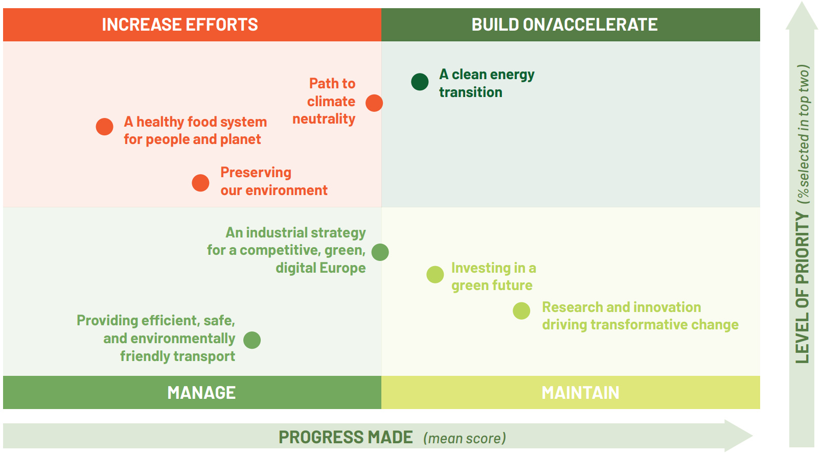 Table combines “How much progress has been made on each of the following thematic areas since the start of the European Green Deal?”and “On which two of the following thematic areas should the European Commission focus its efforts between now and 2024?” questions
